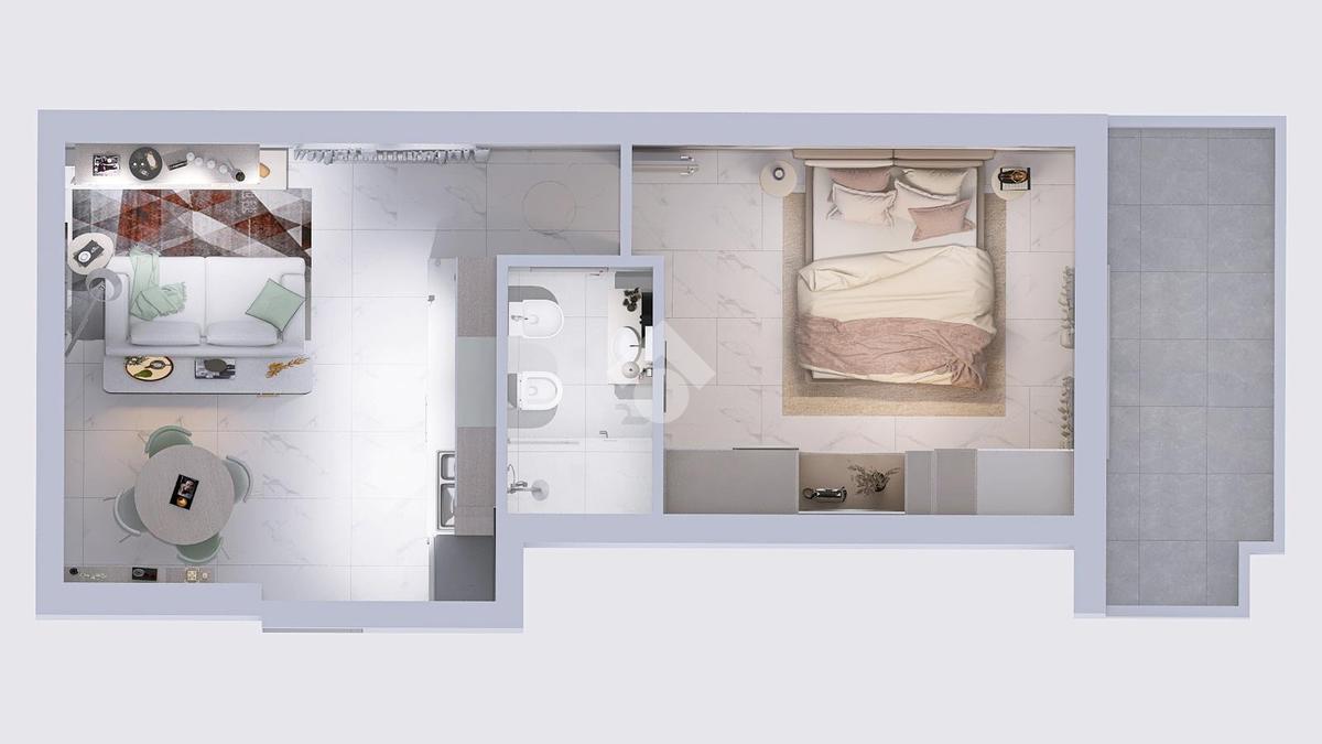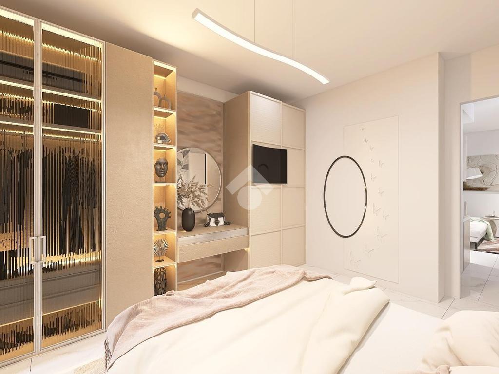 L'appartamento si apre in un'ampia zona giorno con accesso al balcone , condiviso con la camera da letto.